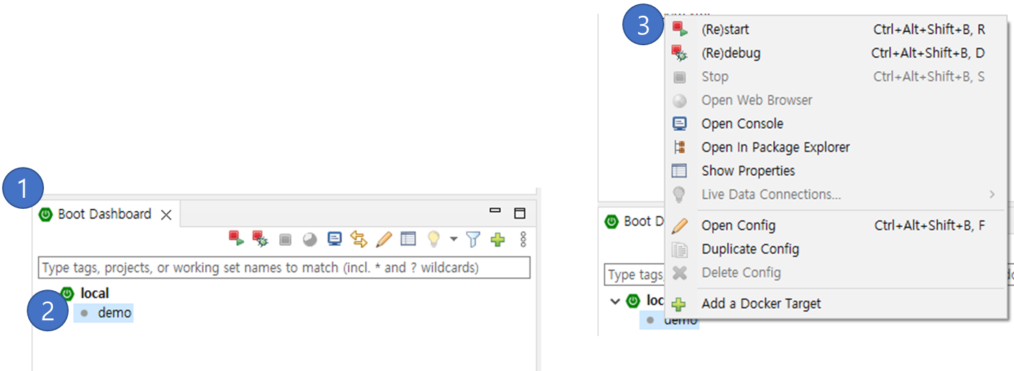 Spring Boot 프로젝트를 실행시킬 때는 sts 하단 [ Boot Dashboard ] (1) -> (프로젝트명) 우클릭 (2) -> (Re)start (3)