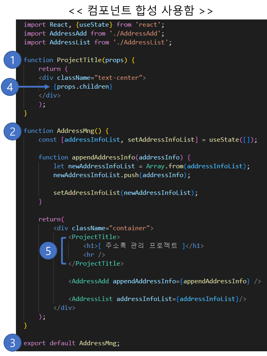(4). 전 글 ( https://codingaja.tistory.com/85 ) 에서는 자식 컴포넌트로 간단하게 "Hi" 문자열을 전달했지만 이번에는 address와 setAddress 를 전달