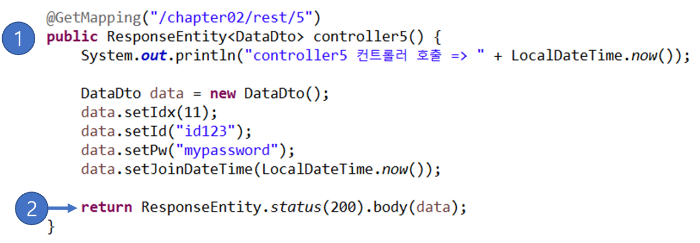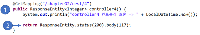 (1). 앞서 얘기했듯 @RestController 애너테이션이 붙은 컨트롤러라도 반환 타입을 ResponseEntity<?> 로 할 수 있음