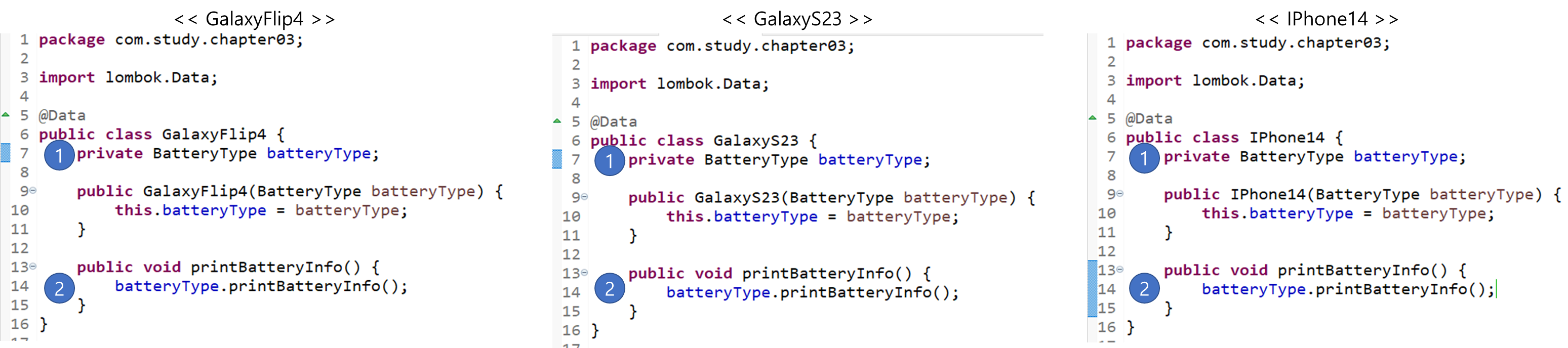 이제 각 스마트폰에서는 문자열 대신 인터페이스를 활용해 다형성이 적용된 베터리 타입을 갖고(1) 베터리 유형에 맞는 정보가 출력(2)되도록 했음