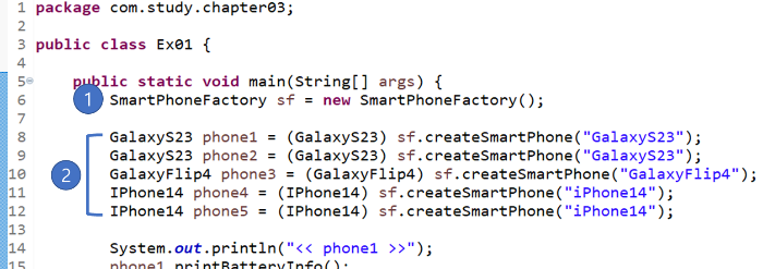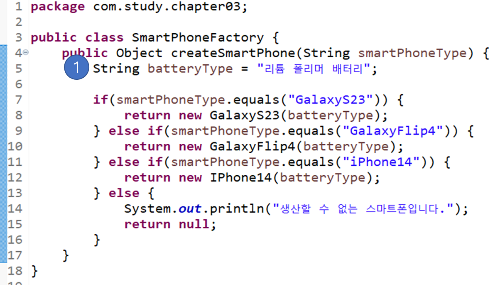 프로젝트 -> com.study.chapter03 -> SmartPhoneFactory 클래스를 추가하고 아래 코드를 추가하자