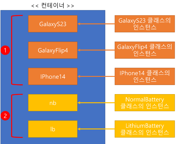 (1)의 빈 색깔과 (2)의 빈 색깔이 다른 이유는 컨테이너 입장에서는 모두 빈이지만 개발자 입장에서는 GalaxyS23, GalaxyFlip4, IPhone14는 필요한 곳에서 꺼내서 쓰기 위한 빈이고 nb, lb 빈은 GalaxyS23, GalaxyFlip4, IPhone14이 의존하고 있는 의존 객체이기 때문에 색깔을 다르게 지정했음